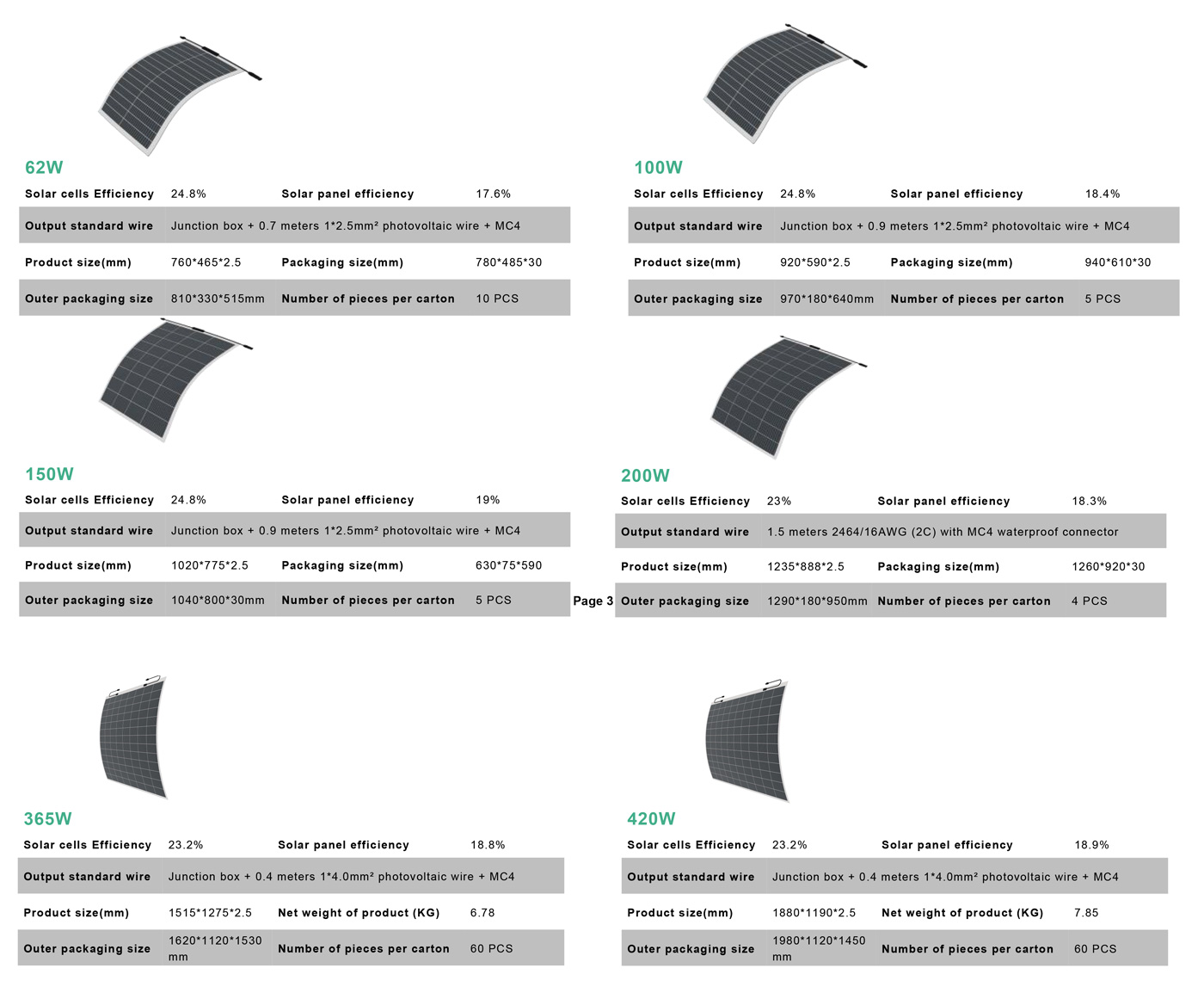 | Parameter | 62W Solar Panel | 100W Solar Panel | 150W Solar Panel | 200W Solar Panel | 365W Solar Panel | 420W Solar Panel |