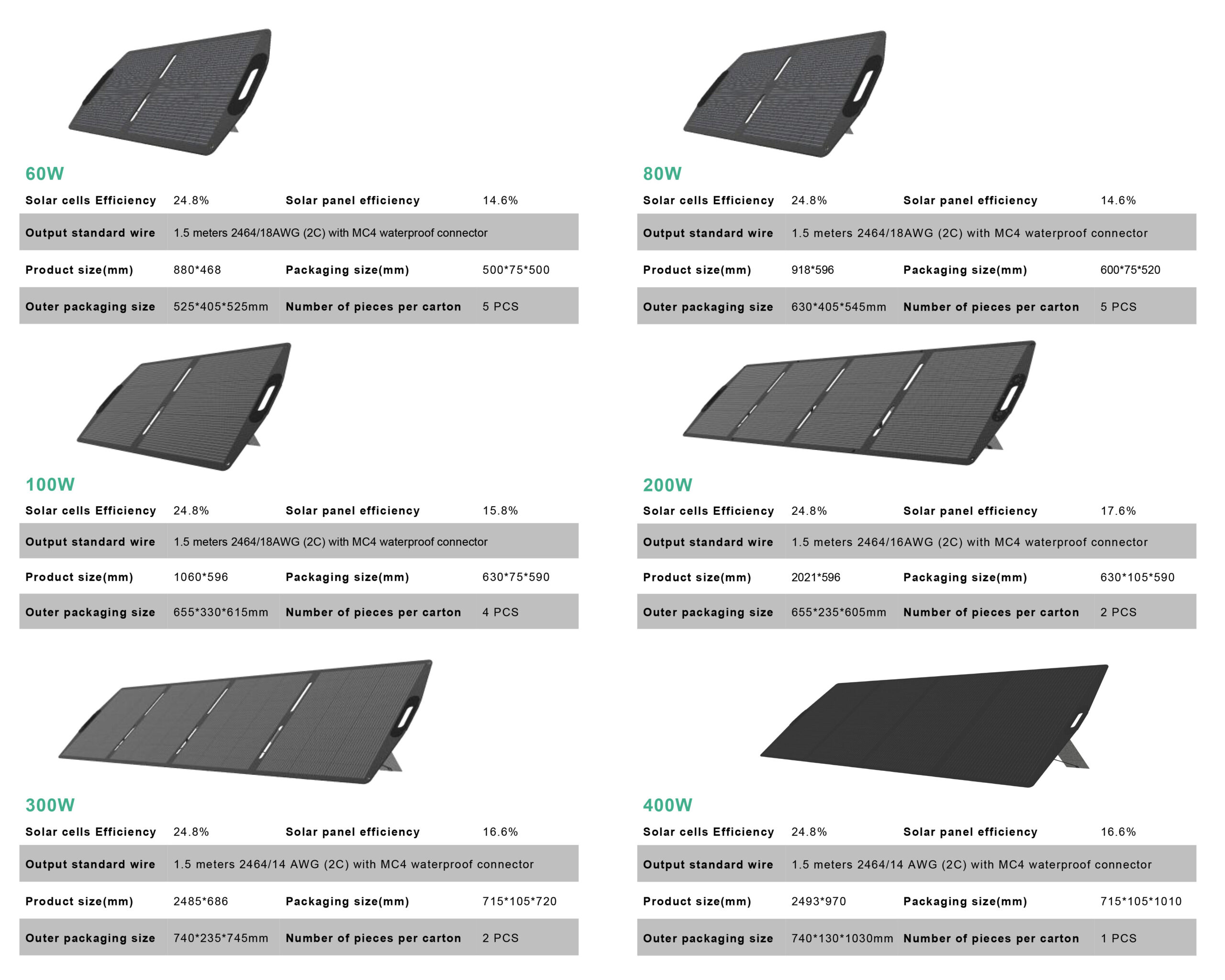 | Parameter | 60W Solar Panel | 80W Solar Panel | 100W Solar Panel | 200W Solar Panel | 300W Solar Panel | 400W Solar Panel |