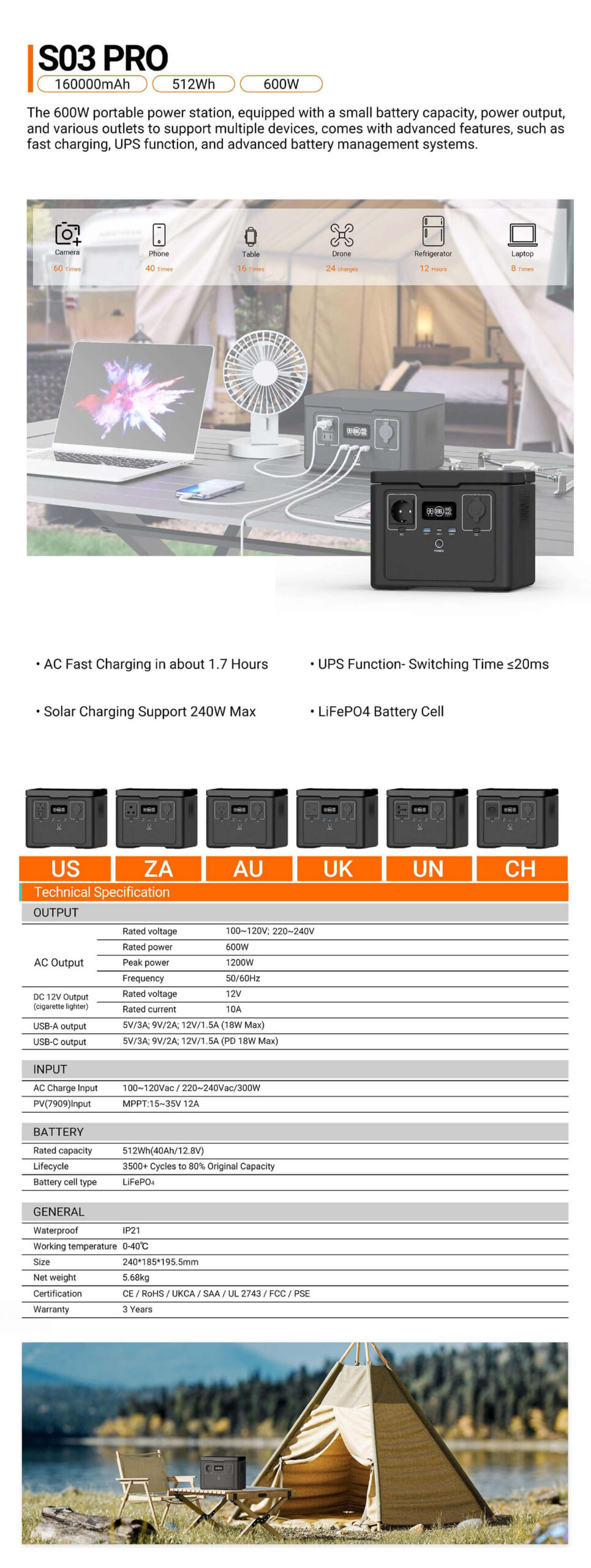 INPUT AC Charge Input 100~120Vac / 220~240Vac/300W