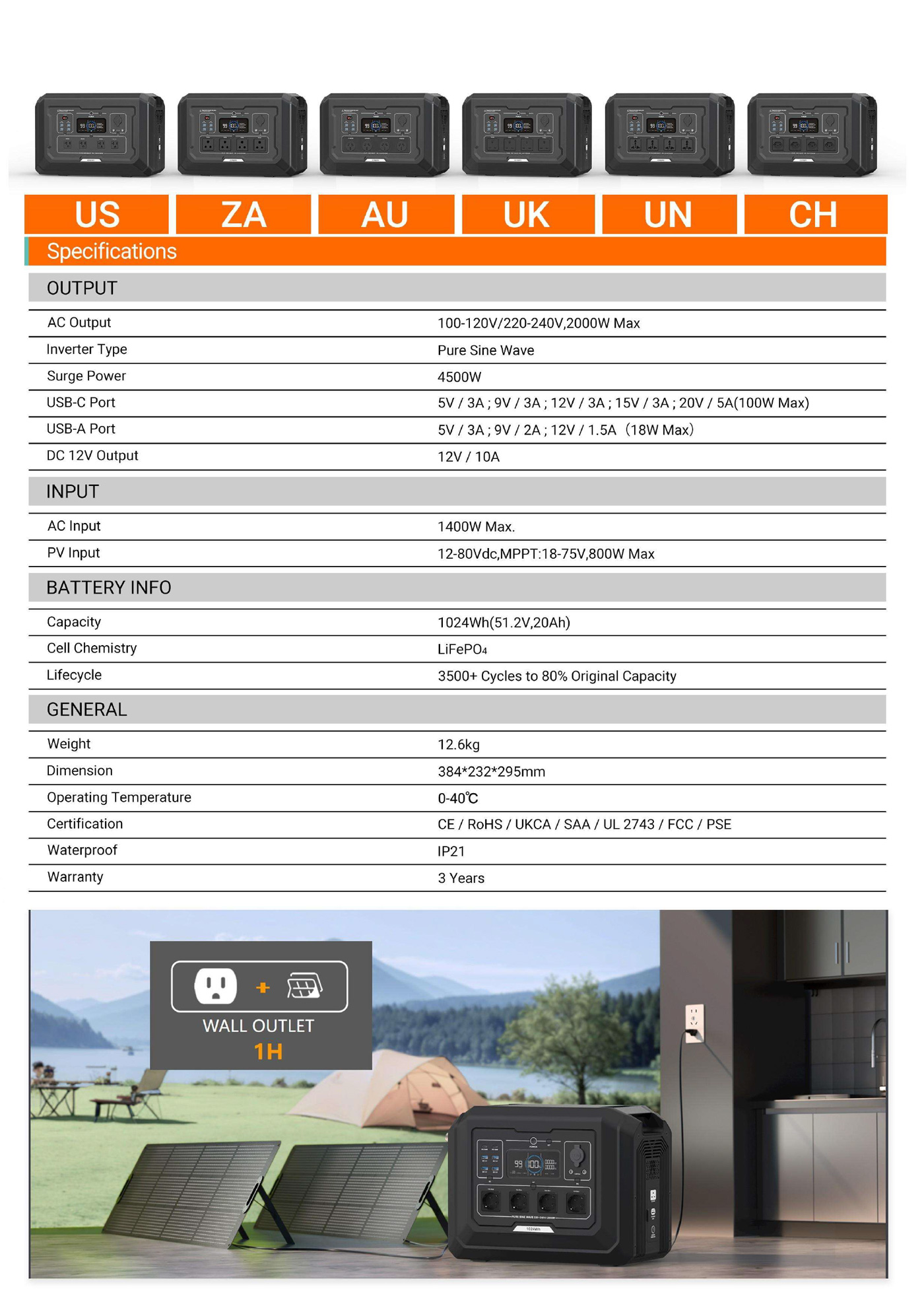 | OUTPUT | AC Output | 100-120V/220-240V,2000W Max |